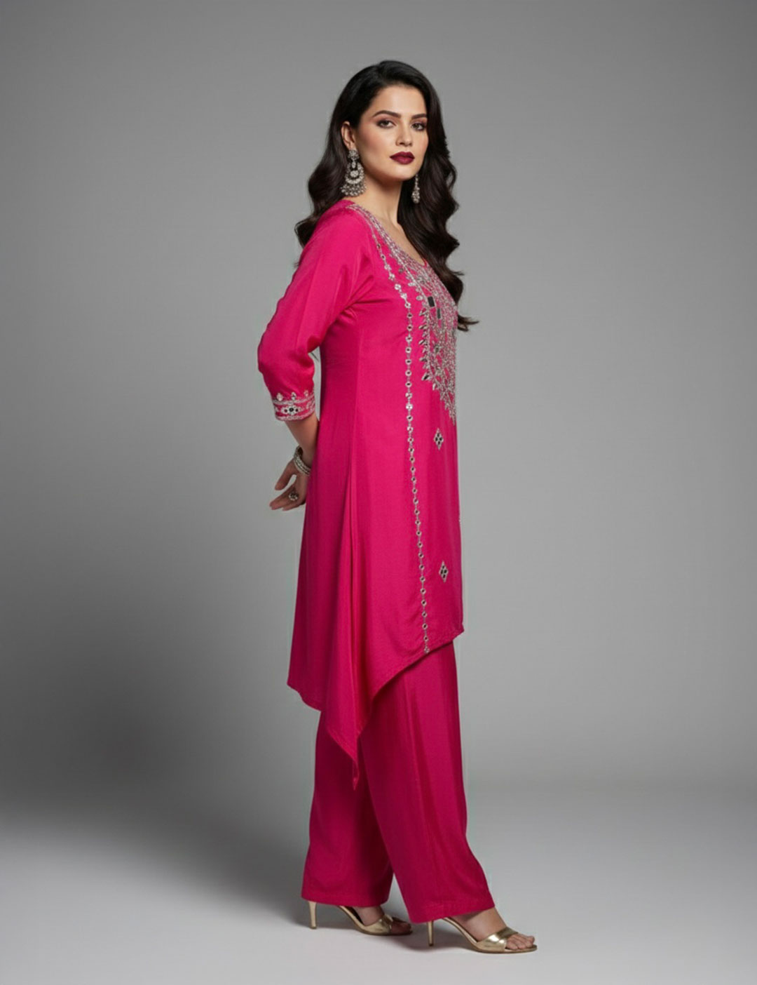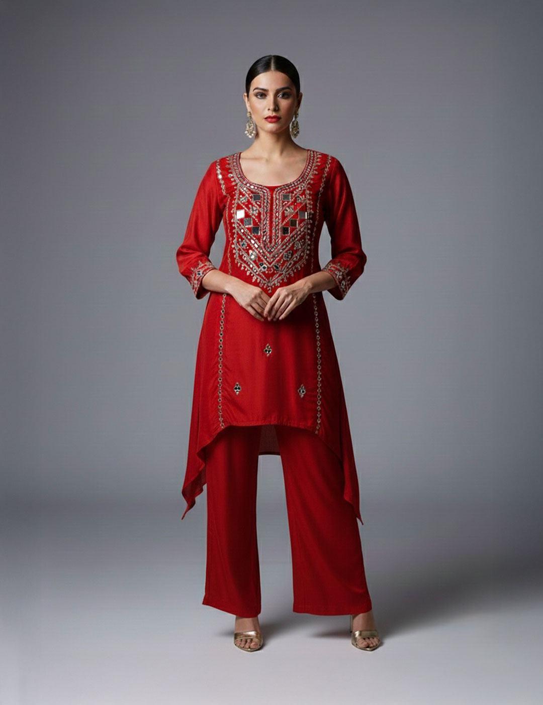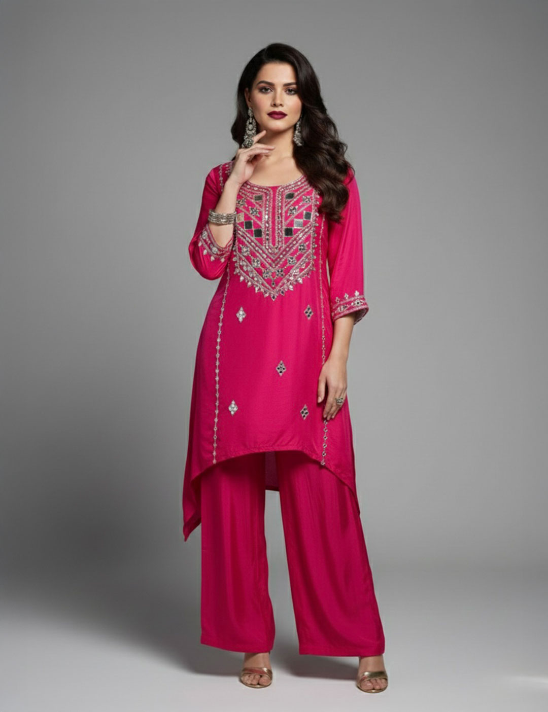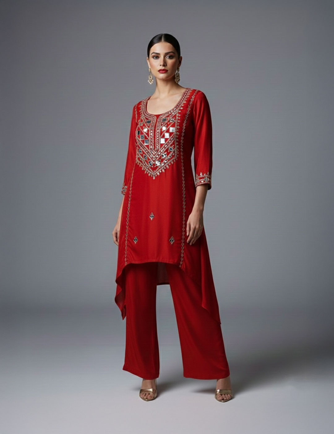 This contemporary set is crafted from fluid georgette and features a side-draped, high-low tunic adorned with intricate mirror work and metallic embroidery. Paired with coordinating wide-leg pants, this elegant silhouette is a perfect choice for festive gatherings, weddings, or formal evening occasions.