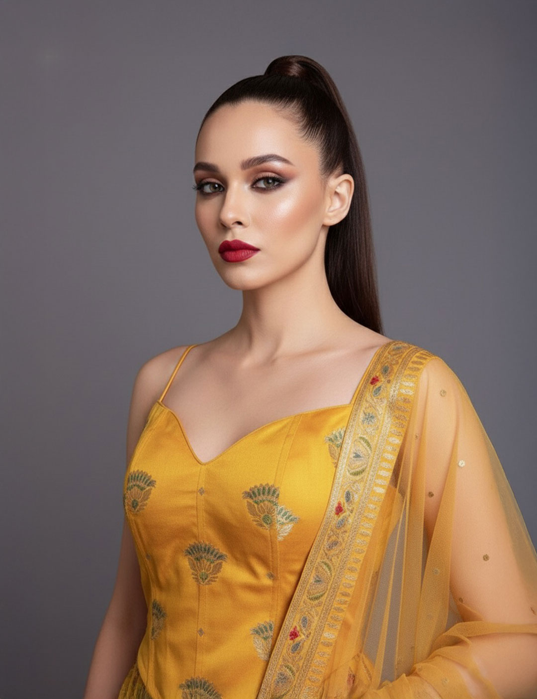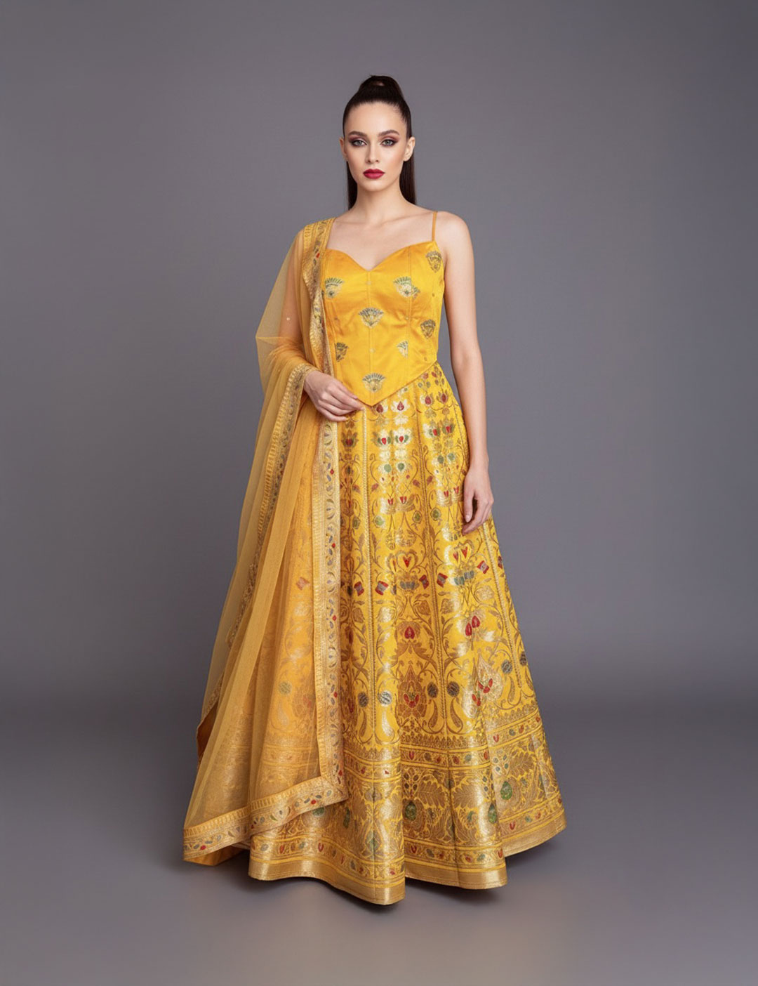 An unapologetically bright Banarasi silk lehenga boasting a dramatic, voluminous silhouette and a sharp, defined fit. The fierce gold weave against the saffron fabric asserts an unmissable, powerful grandeur.