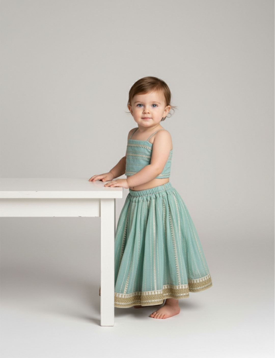 Make a statement with this premium infant set. Featuring a structured A-line silhouette and crafted from a lightweight, woven cotton blend fabric with delicate metallic threading. Designed for an effortless and comfortable baby-fit, this ensemble projects an exclusive, ethereal festive vibe.