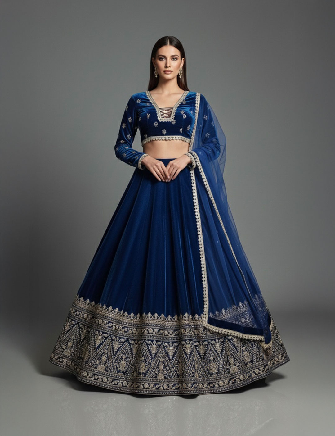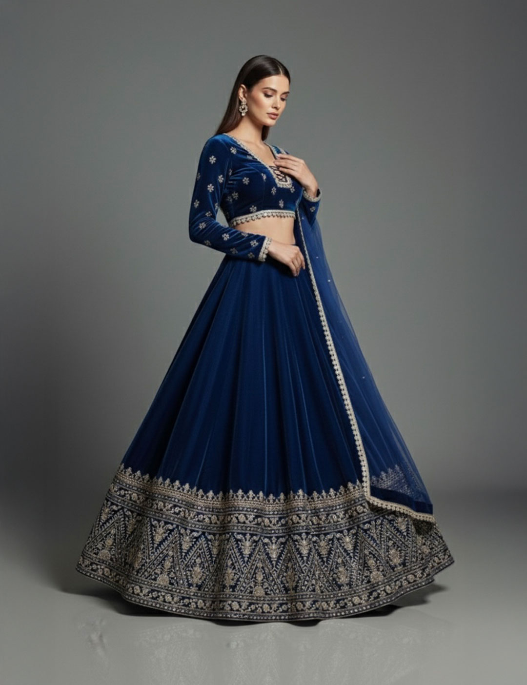 This opulent lehenga is crafted from premium midnight blue velvet, featuring a heavily flared skirt with traditional silver zari and sequin embroidery. The look is completed with a long-sleeved choli boasting an elegant criss-cross tie-back and a tonal net dupatta, perfect for grand winter wedding celebrations.