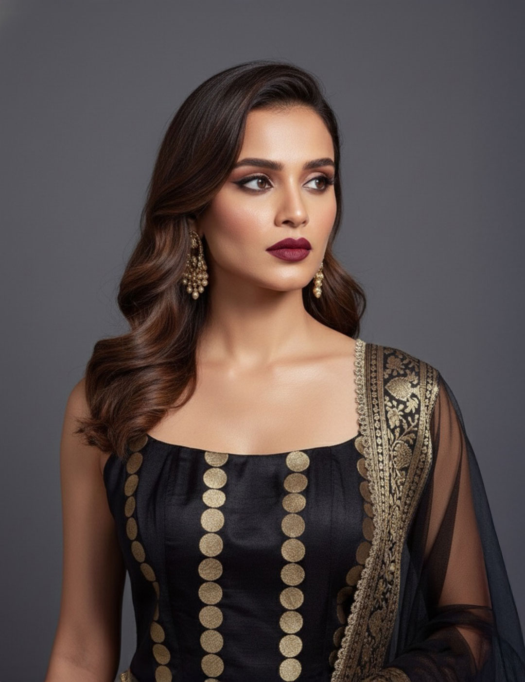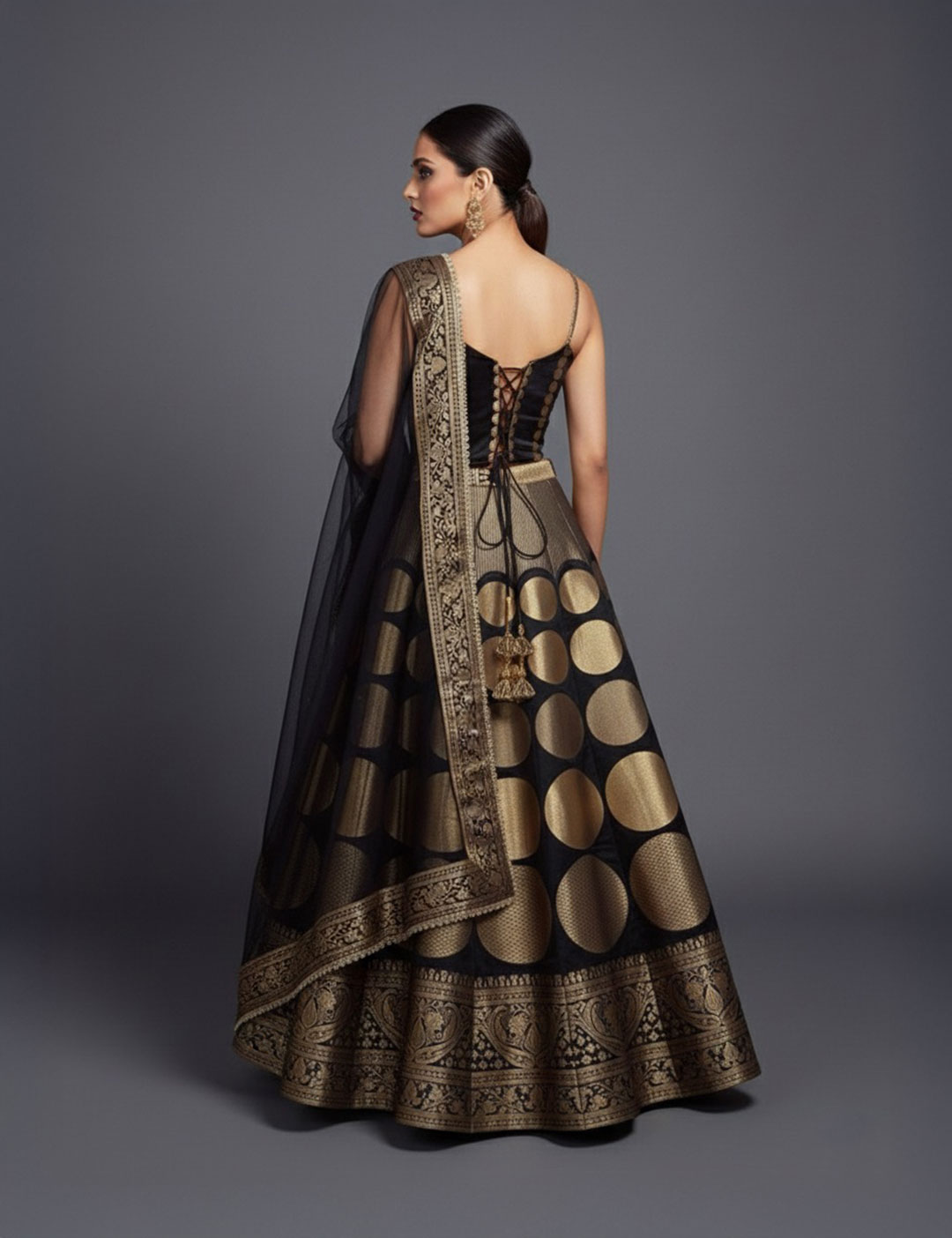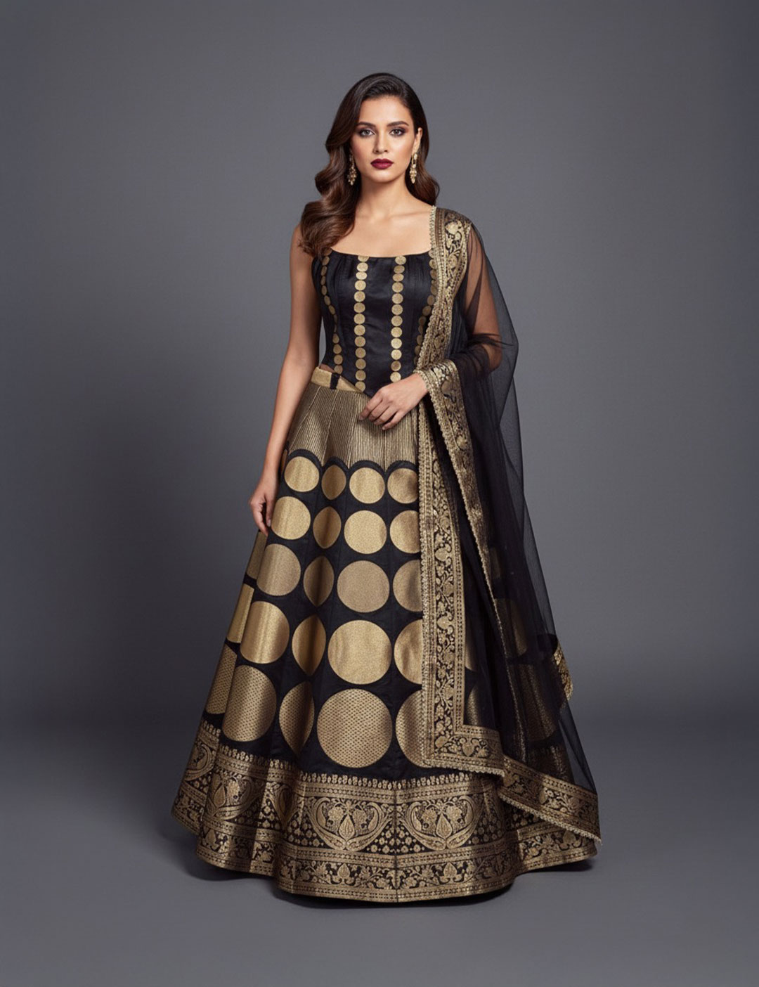 This is a fiercely opulent silk lehenga, featuring a dramatically flared circle silhouette. The controlled fit and rich black and gold palette establish an elite, uncompromising presence.
