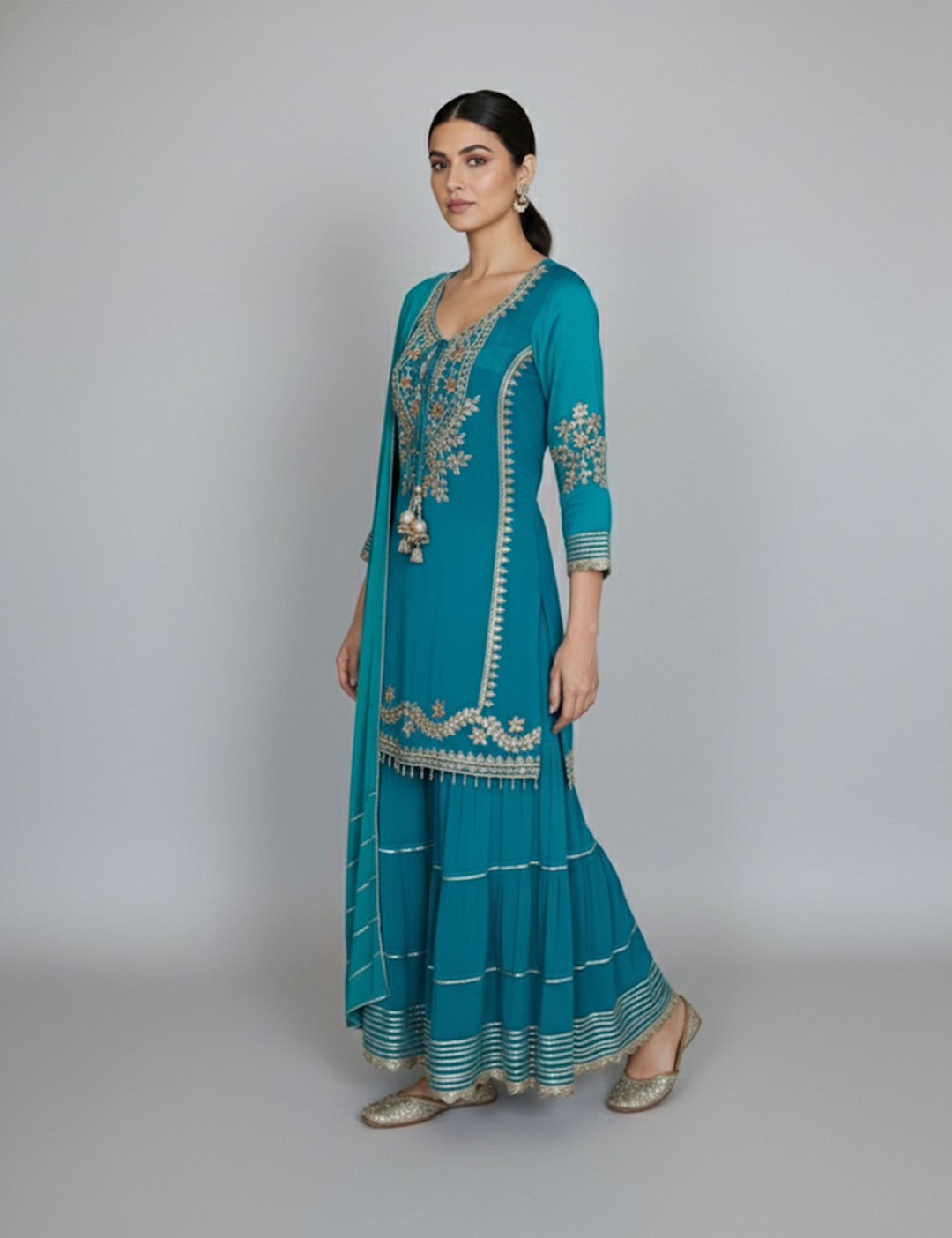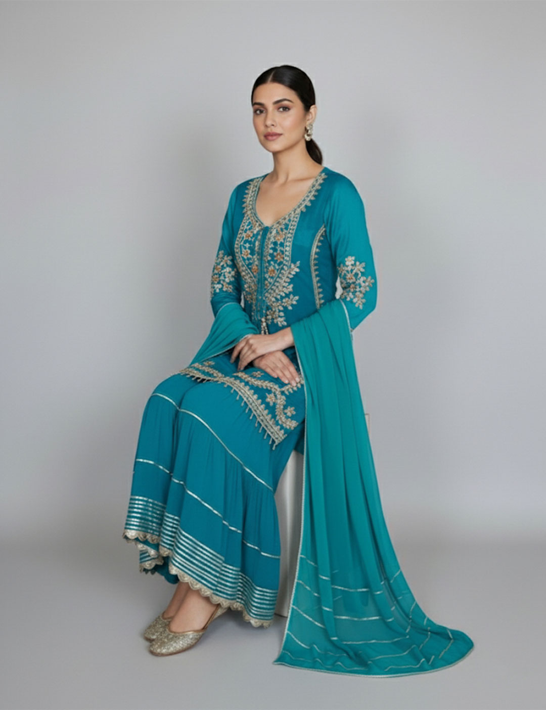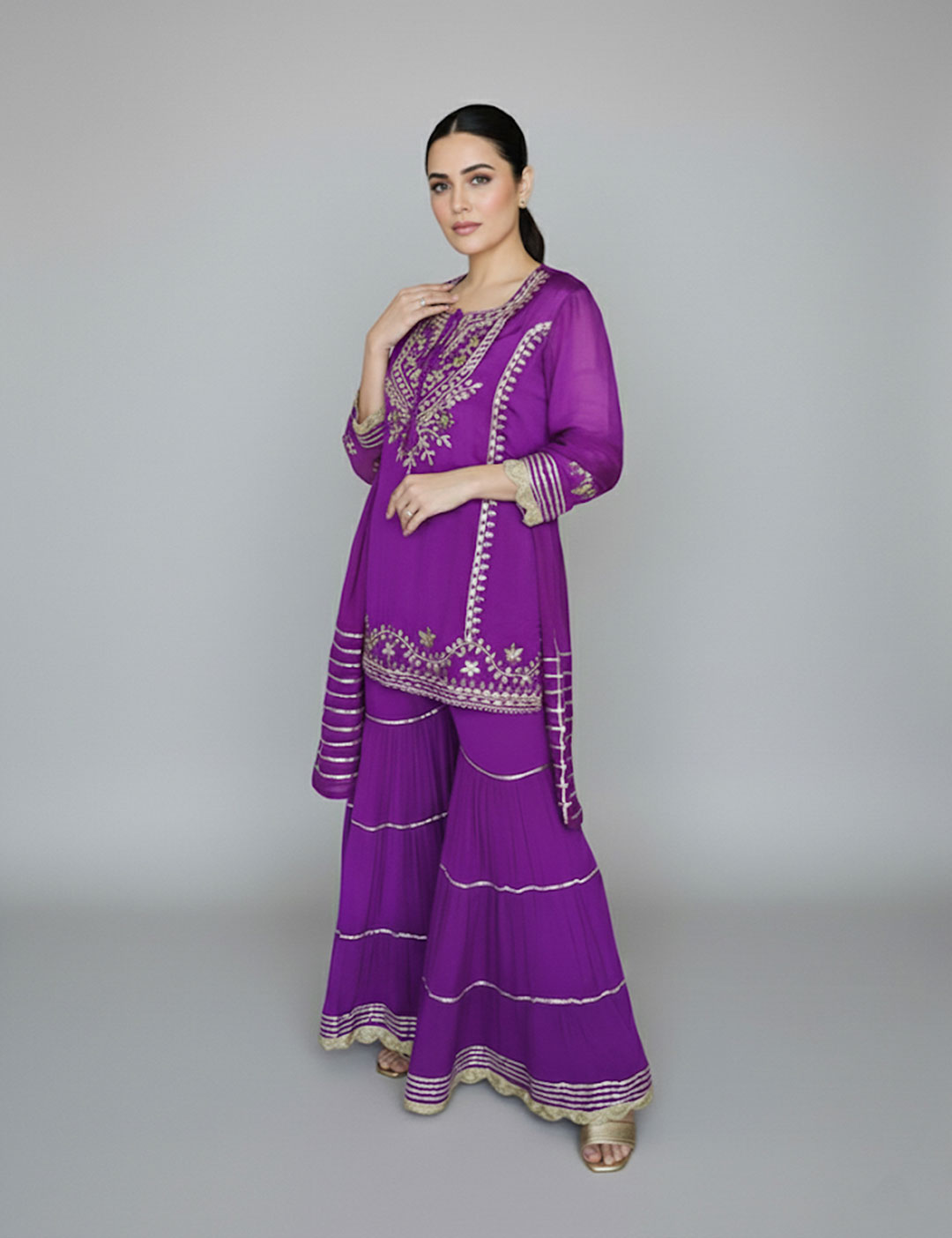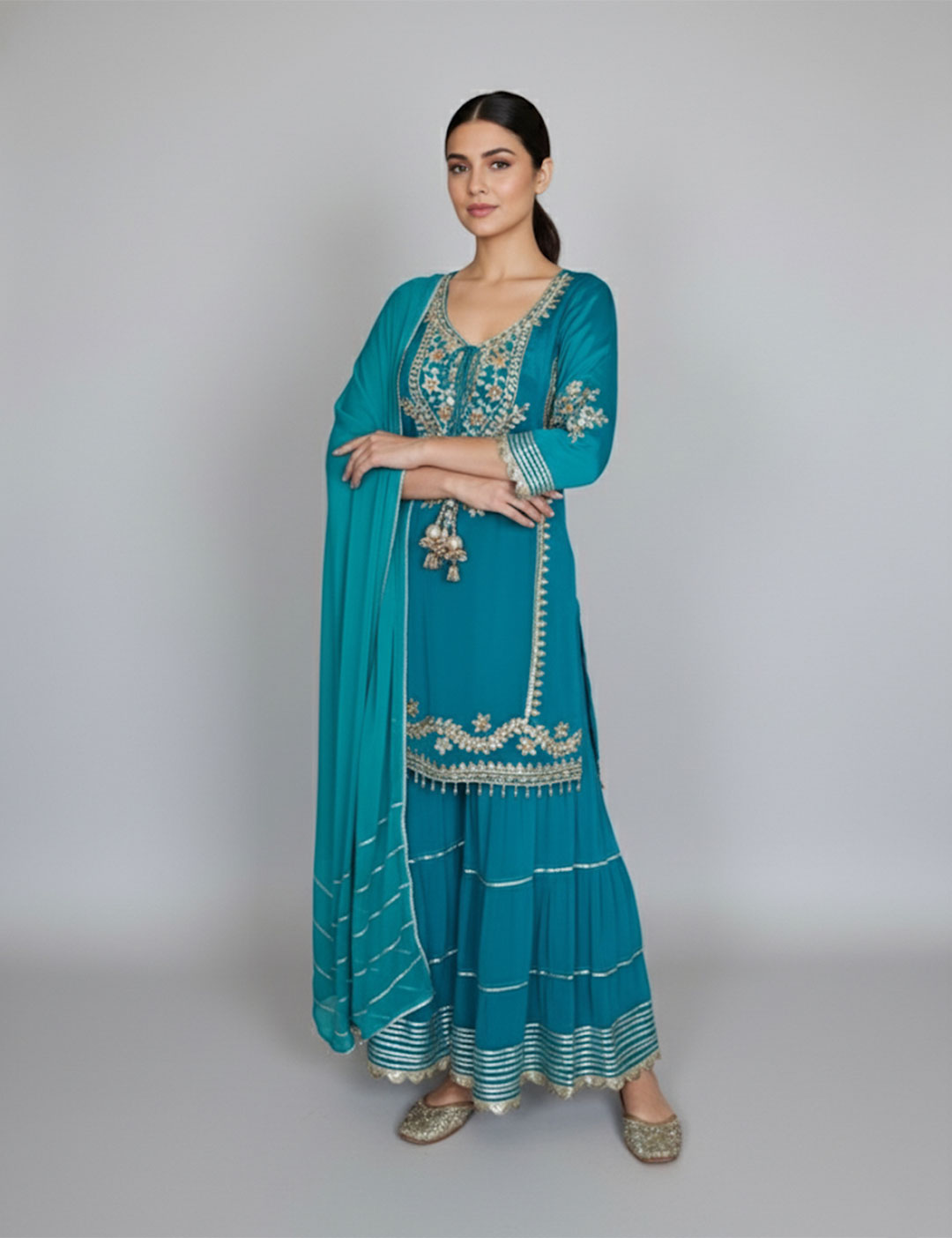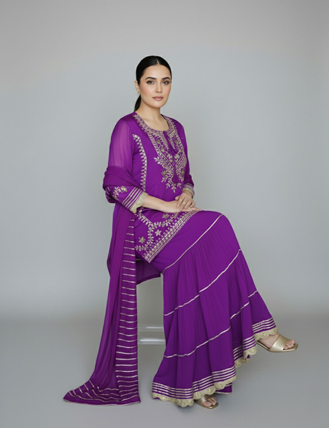 A festive favorite that blends tradition with effortless charm. This mirror embroidered sharara set features intricate mirror and thread work across the kurta and hem, paired with flared sharara pants and a matching dupatta. The rich hues make it a perfect pick for mehendi functions, festive celebrations, or intimate gatherings.