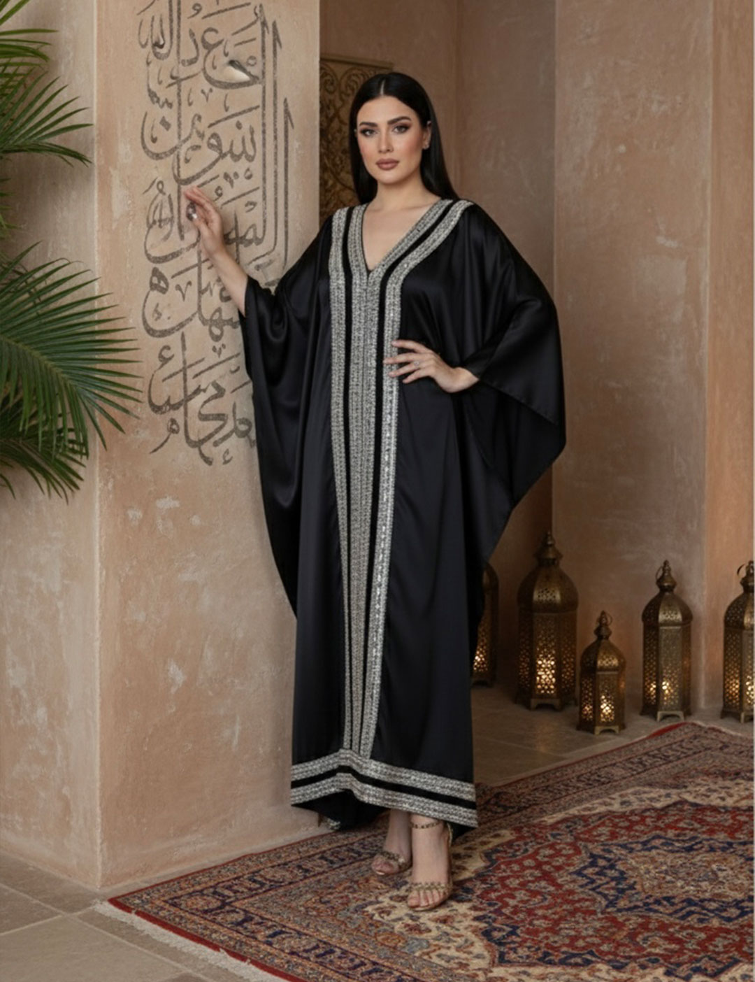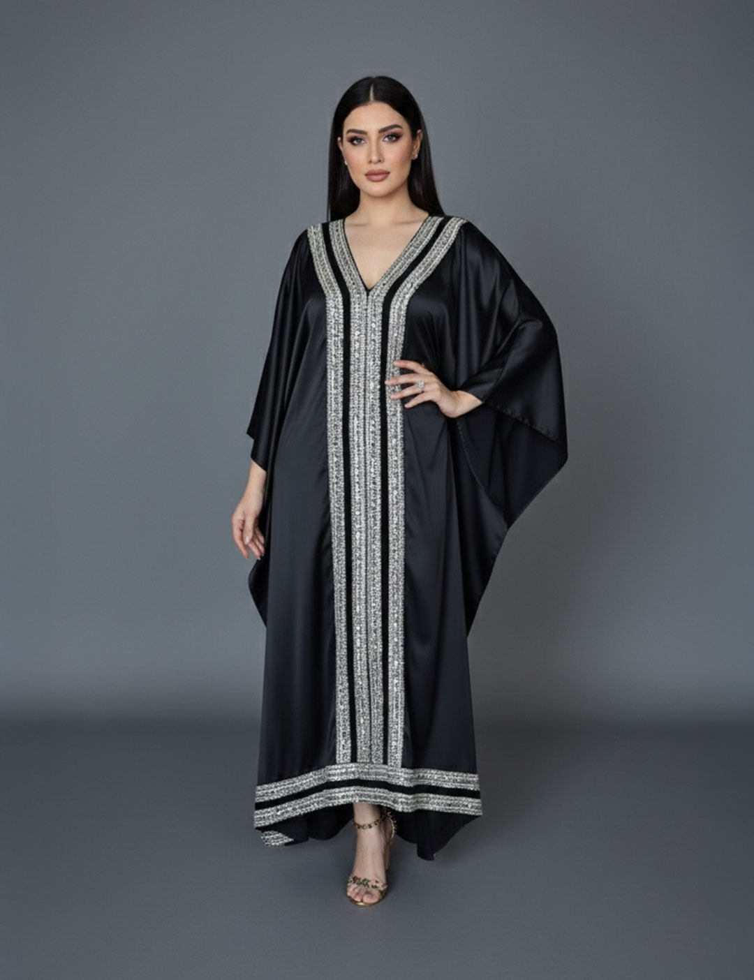 This floor-length gown is crafted from smooth onyx silk satin, featuring a dramatic batwing silhouette and a striking silver vertical embroidered panel along the center. The V-neckline and high-low hemline are finished with matching intricate borders, making it a sophisticated choice for evening galas or formal receptions.