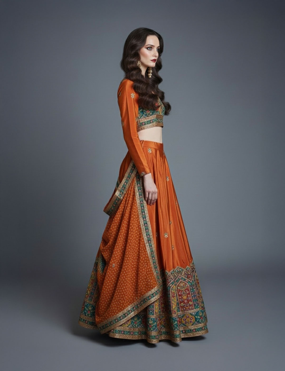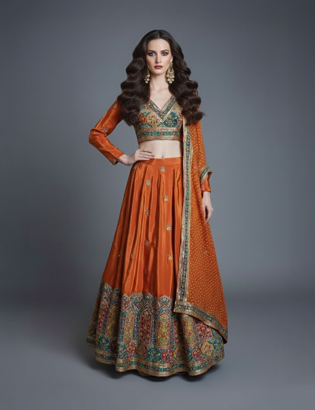 This exquisite set is crafted from rich raw silk, featuring a V-neck choli and dupatta adorned with intricate multi-colored threadwork and gold embroidery. The floor-length lehenga showcases a heavy traditional border with architectural motifs and delicate bootie detailing throughout, making it a premier choice for weddings, bridal trousseaus, or grand festive celebrations.