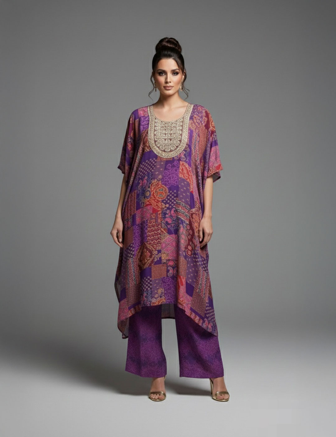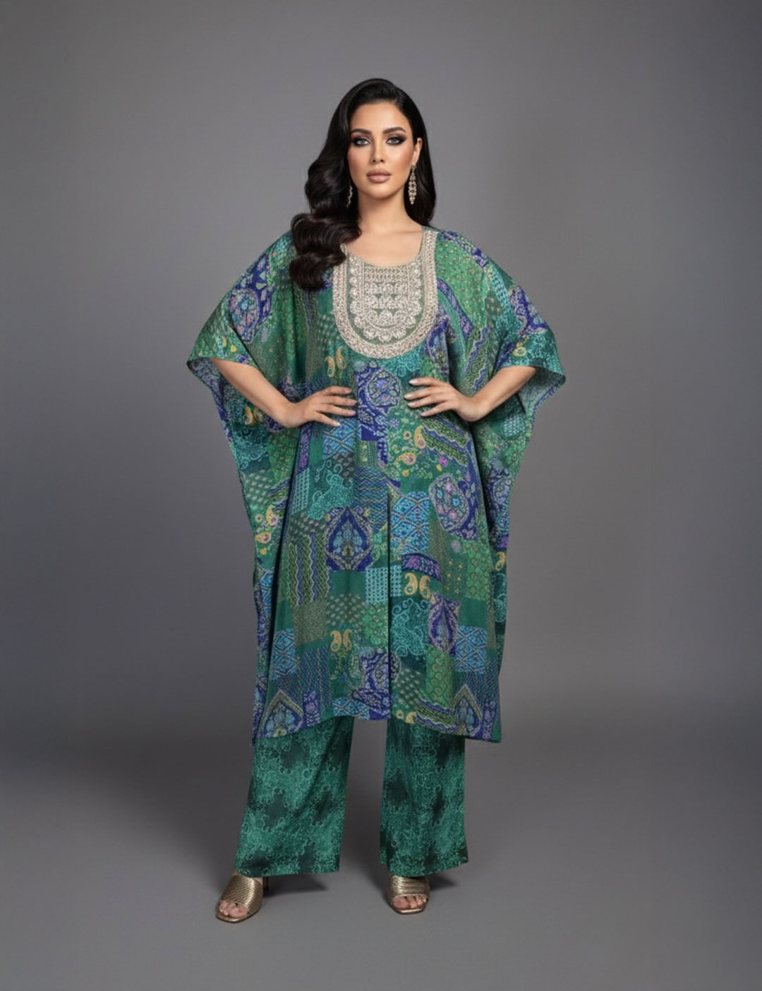 This vibrant co-ord set is crafted from fluid silk, featuring a multi-tonal paisley print and a crystal-embellished U-neckline. The relaxed kaftan-style tunic is paired with matching straight-leg trousers, making it an ideal choice for luxury resort wear or festive evening dinners.