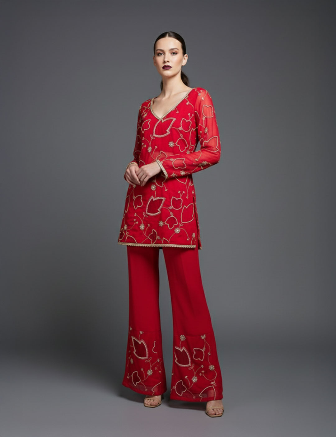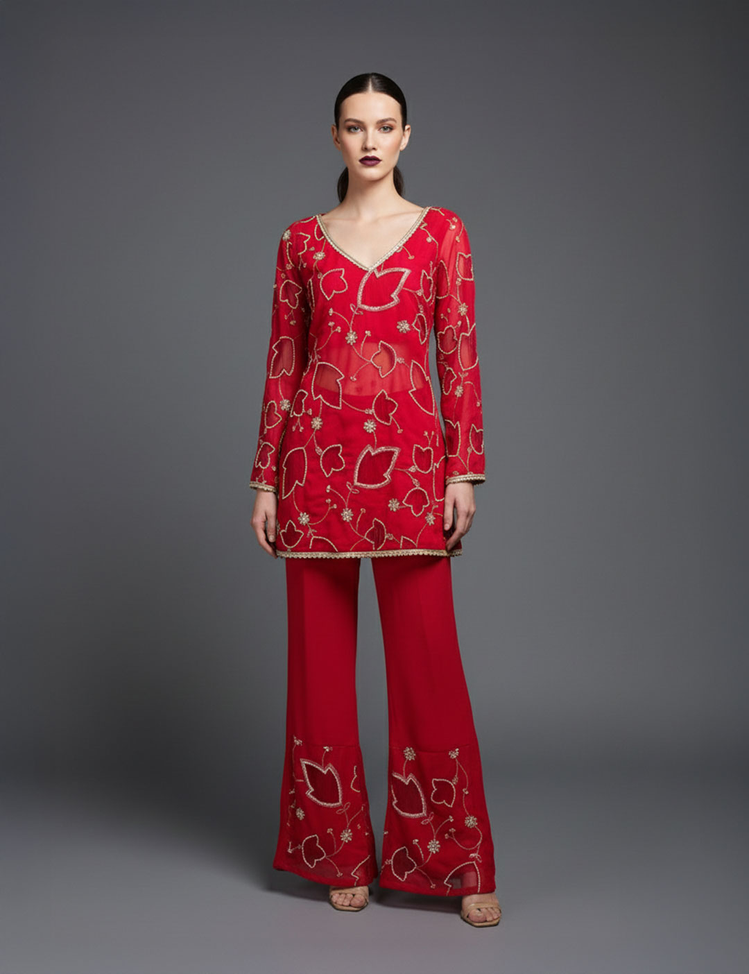 This striking red ensemble features a sheer georgette kurti with intricate gold leaf embroidery and a scalloped hem. Paired with matching flared trousers that echo the embroidery at the base, it is an ideal choice for weddings, festive celebrations, or formal evening events.
