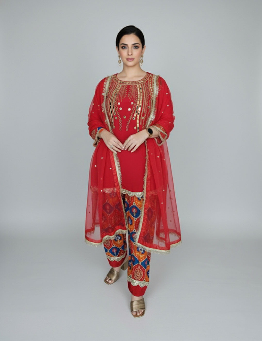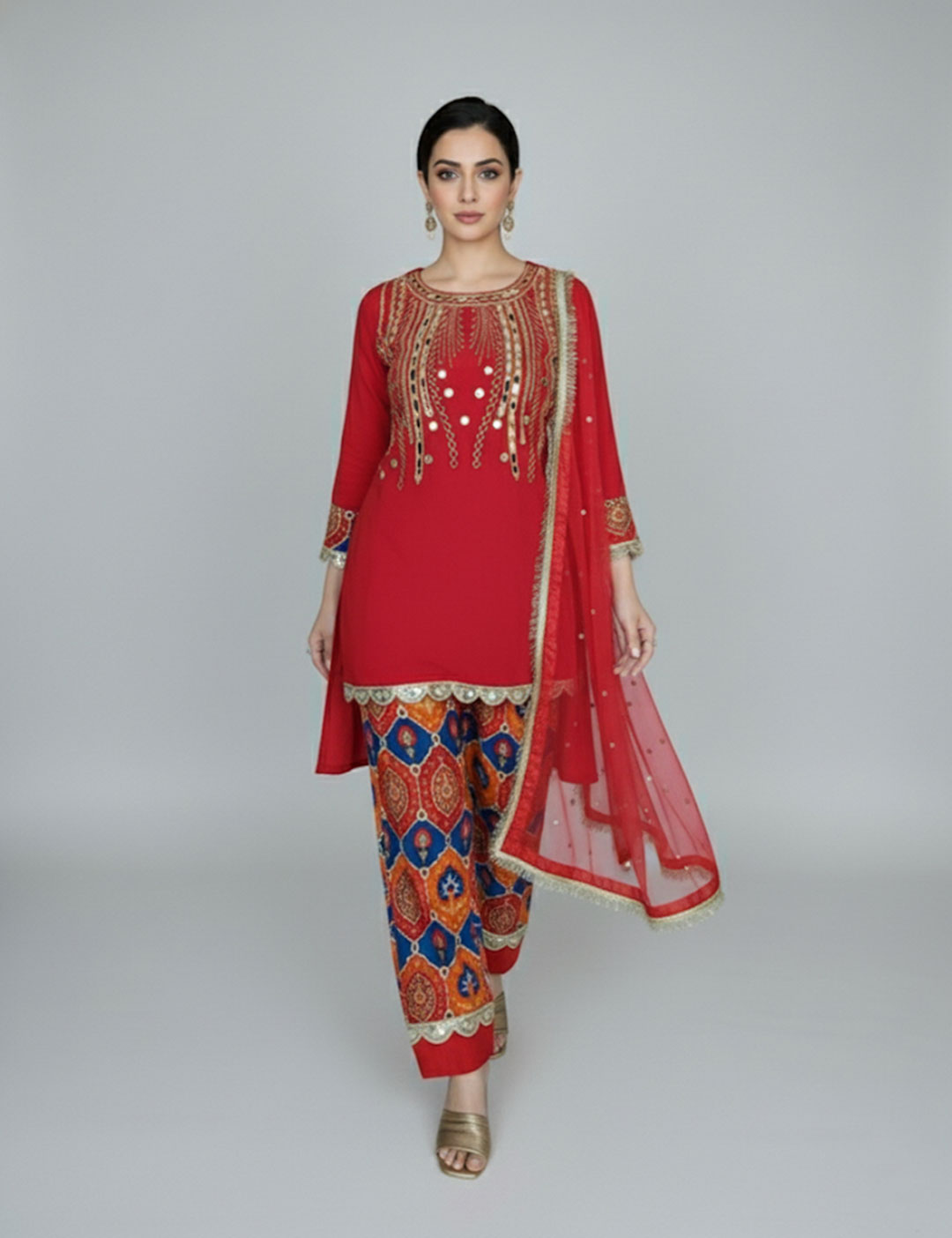 Vibrant, festive, and full of charm — this red Farsi salwar suit captures the essence of traditional elegance with a modern twist. The kurta features delicate gold embellishments and sequin detailing, paired with printed wide-leg Farsi pants and a matching dupatta adorned with printed borders.