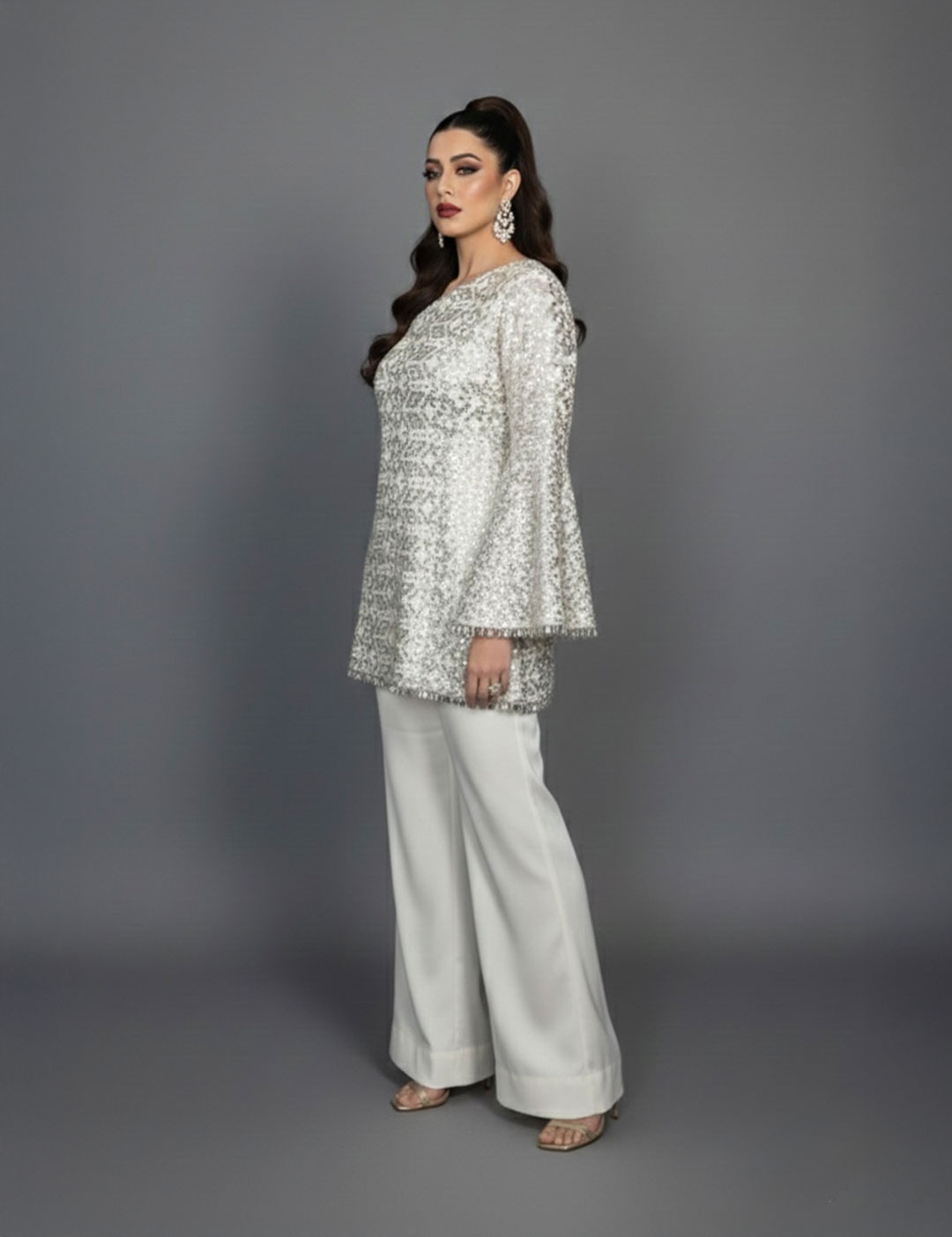 This high-glamour ensemble features an asymmetric one-shoulder tunic drenched in shimmering sequins with a dramatic flared sleeve. The look is balanced by smooth, structured bell bottom pants that create a sleek, elongated silhouette perfect for cocktail parties, red carpet events, or festive evening celebrations.